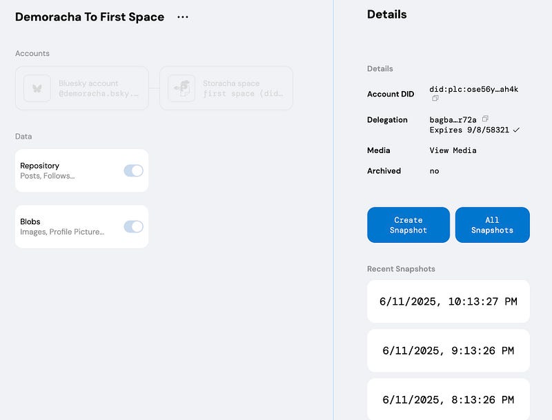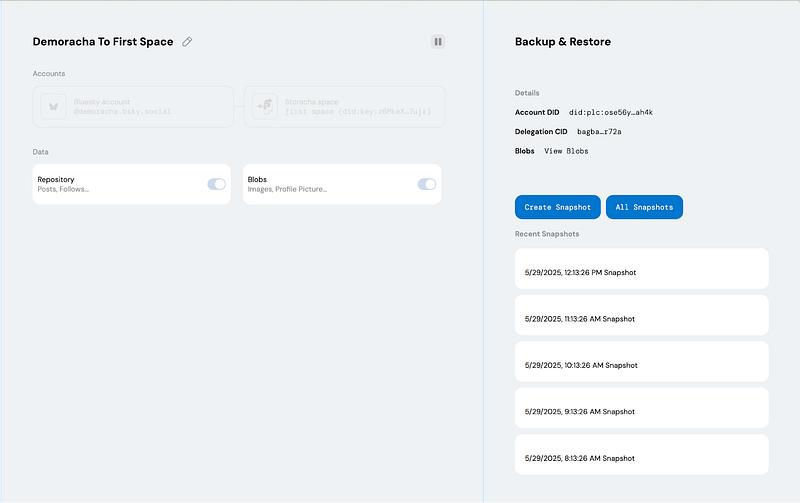 Clicking on an individual snapshot will let you navigate to the repository and blob explorers or let you initiate the snapshot restore process — useful if you’d like to take your content for a spin on a new PDS or fully transfer your identity to a new host.
